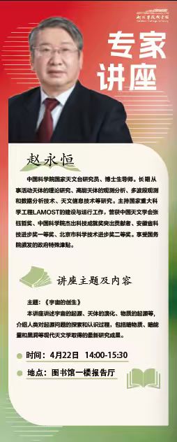 浩瀚宇宙,璀璨星空,藏着多少未解之谜?值此湖州学院第五届读书月之际,图书馆特邀中国科学院国家天文台赵永恒研究员带领大家开启一场探索宇宙起源的奇妙星空之旅!